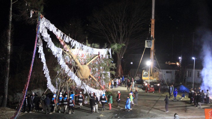 1月14日、小正月行事の道祖神祭り「御神木建て」が行われました。式典後、飾り付けられた御神木は「アラヨーイサー」のかけ声と共に午後6:30から建て始めて7:30に無事建て終わりました。30m近くある御神木は本当に壮大ですので富士山をバックに一目見てはいかがでしょうか。場所は平野コミュニティセンターです。今日の山中湖は晴れ、最低気温-11℃最高5℃16/01/14