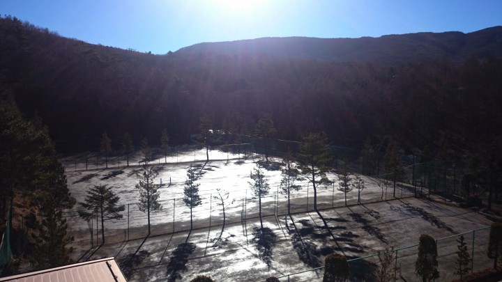 昨日屋上に上って排水の掃除をしましたが、昨日あまりにも景色が良かったので今日も登ってみました。写真は富士山と反対側のテニスコートです。霜が溶けて鏡のように光り輝いています。今日も気持ちがいい山中湖です。今日の山中湖は晴れ、最低気温-7℃最高7℃