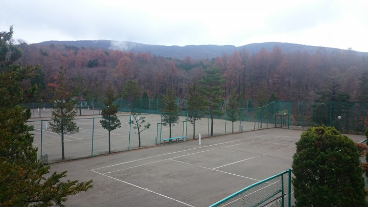 本日、当館所有クレーコートのラインテープを取り外しました。山中湖では冬期期間中、霜柱によりラインテープの釘が抜けてしまうため、あらかじめ取り外しておきます。雪が溶けた春先に再びテープをコートに設置して、新たなシーズンを迎えます。写真は綺麗に撒かれたラインテープです。来年まで一休み。今日の山中湖は晴れ時々曇り、最高気温16℃最低2℃