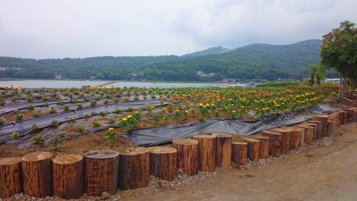 今日は山中湖の周りで多くの人が花を植えています。それぞれの地域ごとに各戸1名ずつ参加しての大規模な花植えです。写真は平野地区の花畑、地域ごとに趣向を凝らしていて、富士山型もあります。山中湖をサイクリングなどで一周しながら楽しんで下さい。