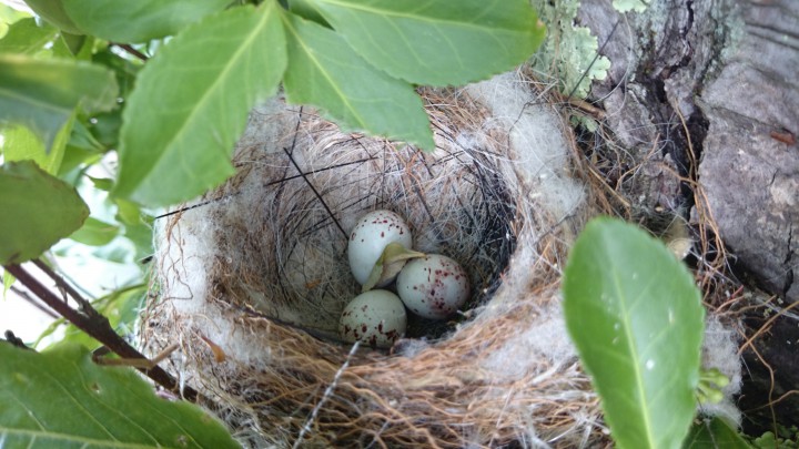 木の上に鳥の巣発見。中には卵が3つ