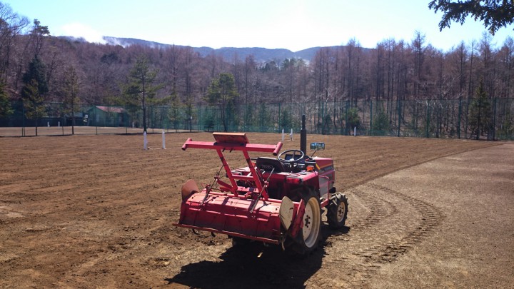 久し振りに朝から青空が見えた山中湖、今日は?5〜7コートの整備を行いました。トラクターで耕してローラーで転圧しH型鋼を引っ張って不陸を取り除き、その後またローラーで転圧しました。明日からはまた天気が崩れて雨が降るようですが、耕したコートを固めるためには恵みの雨です。