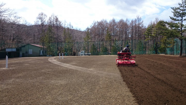 当館はテニスコートをトラクターで耕してから転圧しています。今日は?1〜4コートの整備を開始しました。トラクターで耕し軽いローラー&重いローラーで転圧後、I形鋼を引っ張ることで表面を平らにしてその後重いローラーで転圧しました。