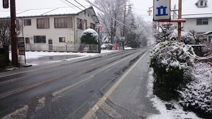 今日の山中湖は雪、最高気温5℃最低-3℃。共立テニスロッヂでの積雪は10cmでした。道路には雪が残っていますので、気をつけて運転して下さい。