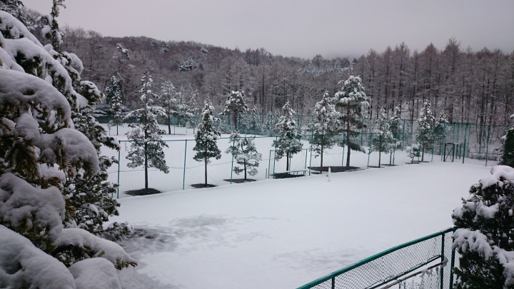 テニスコートが雪で真っ白です