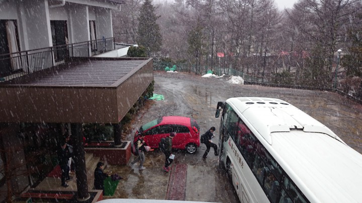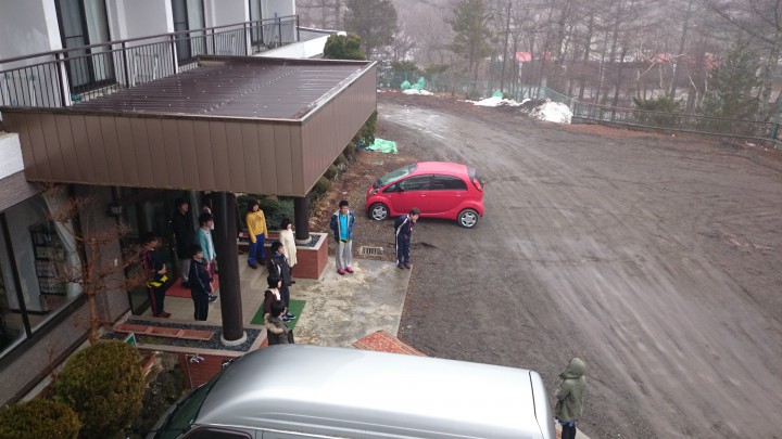 アナウンスの皆さん、4泊5日の合宿お疲れ様でした。今回の合宿は楽しい大学生活の中でも一番の思い出になったと思います。スタッフ一同、またのお越しをお待ちしております。ご利用ありがとうございました。今日の山中湖はみぞれ、最低気温0℃最高6℃15/03/01