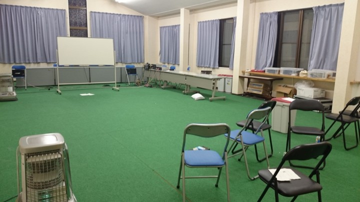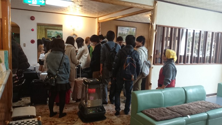 合宿中のアナウンスの皆さんは各班に別れて練習中。写真は朝から発声練習中の班の方です。朝からどんより雨模様の山中湖ですが、当館は元気な声で朝が始まりました。今日の山中湖は雨一時みぞれ、最低気温0℃最高3℃15/02/26
