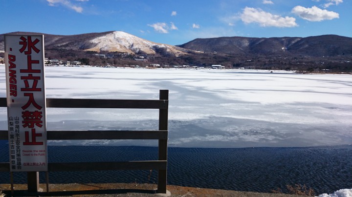山中湖、氷上立ち入り禁止です。