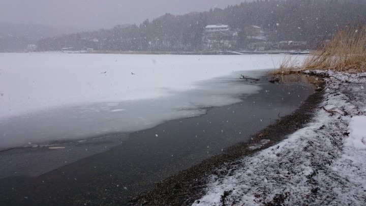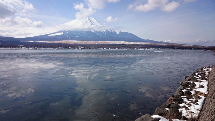 寒さの恩恵がこんな所にありました。山中湖の氷が部分的に氷が張り、そして溶けては砕け、波に揺られながら漂っています。波も穏やかなので、比較的簡単に「逆さ富士」を写真に収めることができるでしょう。今日の山中湖は晴れ、最低気温-12℃最高5℃でした。日が落ちてからの山中湖は本当に寒いです。