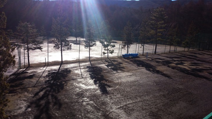 久しぶりにテニスコートの写真を撮ってみました。朝9時30分だとまだ霜は溶けていません。日光が当たってくると次第に溶けて水がしみてきます。雪はこれから降る季節ですが、暖かい春が恋しいです。