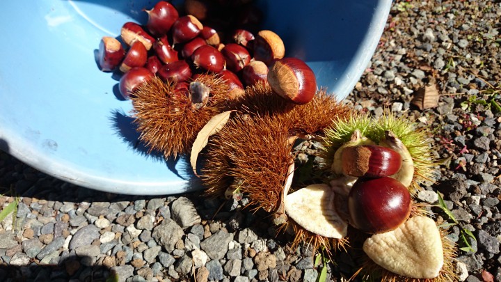 知り合いの庭で大きな栗を大量に収穫してきました。とても大きな栗でバケツに2杯、童心に返って一心不乱に収穫に励みました。虫食いも無く、早速煮込んで頂きました。皮としぶを取って生で食べてもコリコリして美味しいです。この時期、栗拾いは楽しいです。