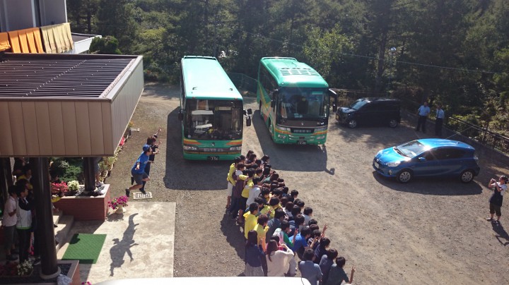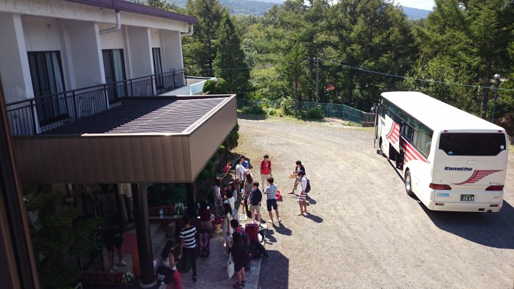 パーシモンテニスクラブ様、3泊の合宿に当館をご利用いただき誠にありがとうございました。皆さんとても仲が良い団体様でした。またテニス終了後のコートブラシ掛けには助かりました。スタッフ一同、またのお越しをお待ちしております。写真は玄関前の集合写真を激写、2人が宙に浮いる面白い写真です。今日の山中湖は晴れ、最高気温21℃最低4℃。14/09/21