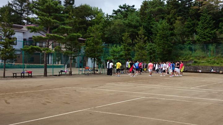 午前中は雨のためテニスは出来ませんでしたが、午後からローランギャロ様は各コートに分かれて元気に練習しました。写真は練習前の円陣です。上級生がしっかりしているので、まとまりがありますね。夜は恐怖の『肝試し』、イベント盛りだくさんで楽しい合宿です。