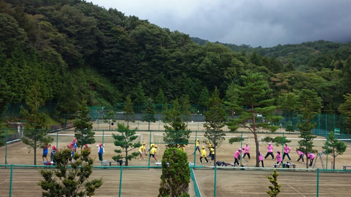 宿泊中のテニスパーソンズプロジェクト様のユニフォームは3種類、青赤のマリオ班、黄色のピカチュー班、ピンクのカービィ班。皆さん仲が良くて楽しそうです、すばらしい合宿にして下さいね。今日は全員でダブルスの試合をしました。今日の山中湖は曇り夕方から一時雨、最高気温21℃最低13℃、寒い一日でした。