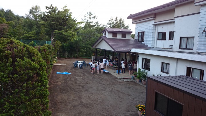 昨日からお越しのテニス部の皆様は夕食にバーベキューを楽しみました。気の合う仲間とたくさんテニスをした後のバーベキューは最高ですね。富士山を見ながらかんぱーい。今日の山中湖は晴れ時々曇り、最高29℃最低17℃。