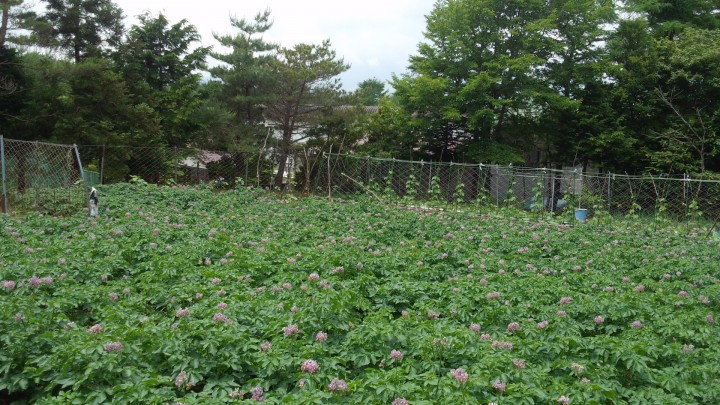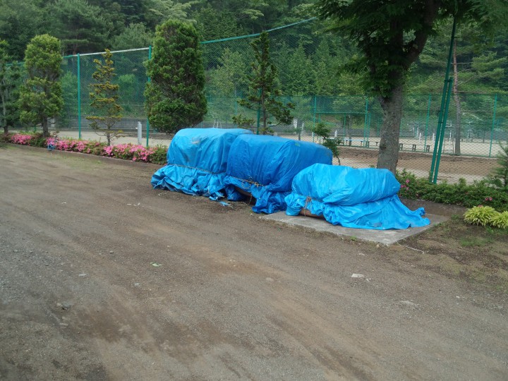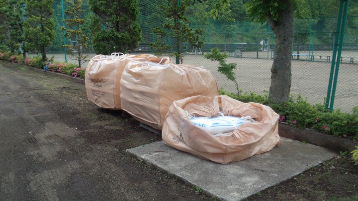 6月28日にお知らせした塩化カルシウムですが、テニスコートに散布するまでまだ日数があります。現在はブルーシートで覆って養生中。直射日光や雨から防いで品質を確保しています。14/07/04