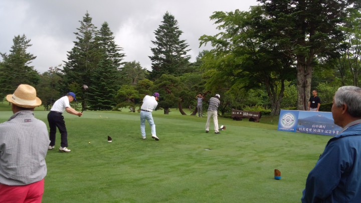 今日は第22回山中湖村村民ゴルフ大会がありました。村内にある富士ゴルフクラブにて、約130名の方がゴルフを楽しみました。村名変更50周年記念大会とのことで、皆さん豪華な賞品をゲットしていました。写真は始球式。