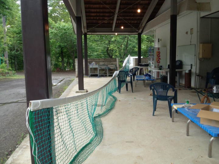 今日の山中湖は朝から雨でした。7月に入っても晴れ間が余りなく、そろそろ晴れて欲しい気がします。写真は屋根下でネットの白帯を交換しているところです。これで5個目、予定ではあと2個仕上げる予定です。綺麗になったネットを期待していて下さいね。