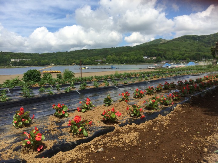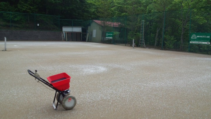 今日も各地で夏のような天気が続いて、北海道では昨日37.8℃を記録したようです。ここ山中湖は比較的涼しく、最高気温21℃最低13℃。中国、近畿、東海では今日、梅雨入りしたようです。当館では本日、テニスコート整備の一環として塩化カルシウムをクレーコートに蒔きました。