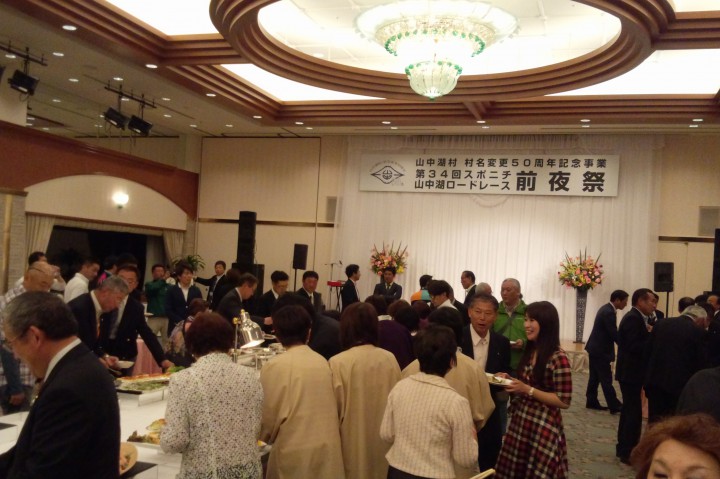 今日は山中湖村村名変更50周年記念としてスポニチ山中湖ロードレース前夜祭が行われました。写真は夜の部、関係者が集まって当日大成功するようにお互いの士気を高め合いました。14/05/24