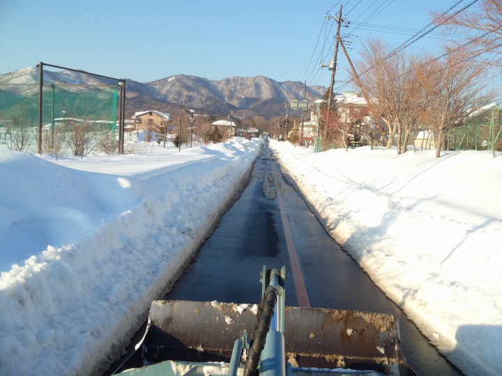共立テニスロッヂまでの道の大がかりな除雪作業がだいたい終わりました。重機では掻けない場所は人の手で…ということでスタッフ総出で細かい所の雪かきを行いました。たまに差す日差しがとても暖かかったです。