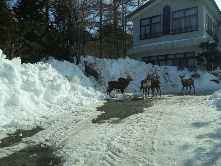 共立テニスロッヂの庭に野生の鹿が現れました。9匹です。人間になれているのか、人を見ても車を見ても全然逃げません。夕方にはどこかへ行ってしまいました。