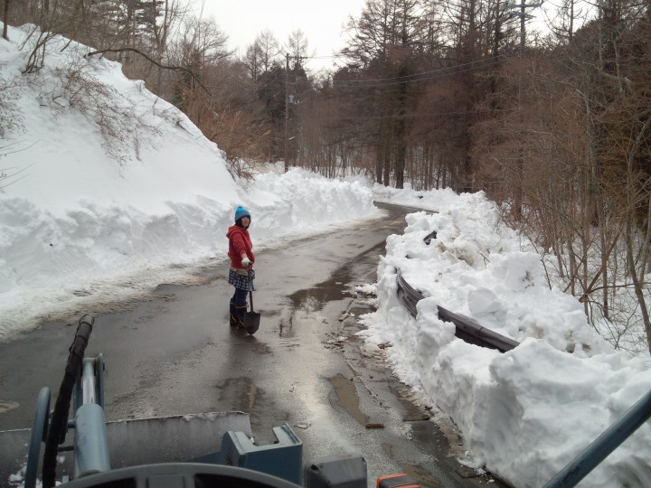 共立テニスロッヂまでの道の大がかりな除雪作業がだいたい終わりました。重機では掻けない場所は人の手で…ということでスタッフ総出で細かい所の雪かきを行いました。たまに差す日差しがとても暖かかったです。14/02/24