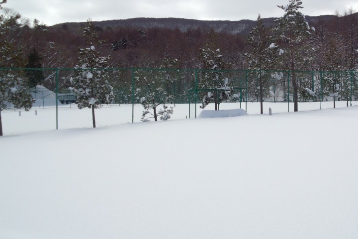 昨日の大雪で、前日まで雪の無かったテニスコートがご覧のとおり銀世界になりました。テニスコートのポールの高さは107cmなのですが、写真を見ると30cmほどしか出ていませんので、積雪量は約75cm。
