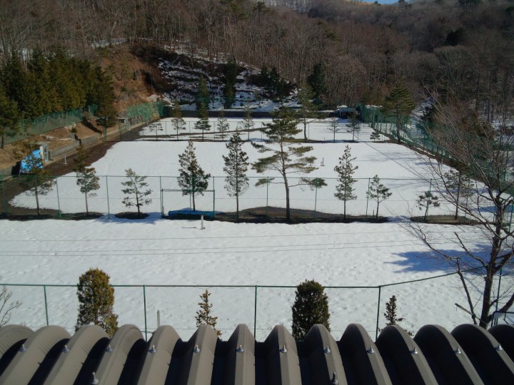 テニスコートにはまだ雪が積もっています。おそらく鹿であろう足跡が多数残っています。テニスコートが利用できるようになるまで、あと2ヶ月…といったところでしょうか。今しばらくお待ち下さい。14/01/29