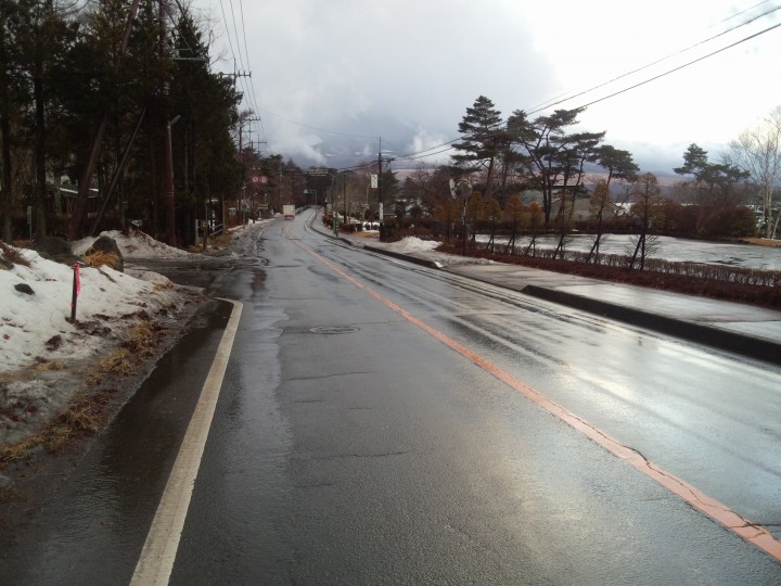 朝方、春一番かと思うほどの生暖かい強風の山中湖は、青空からだんだんと曇って雨となりました。山中湖平野地区の氷は割れて浜に打ち上げられてしまい、昨日までワカサギの穴釣りでにぎわっていたのですが、今シーズンは恐らく穴釣りは終了かもしれません。写真は雨が止んだ午後5時の国道413号線、道路の雪もすっかり無くなりました。最高気温は9℃。14/01/30