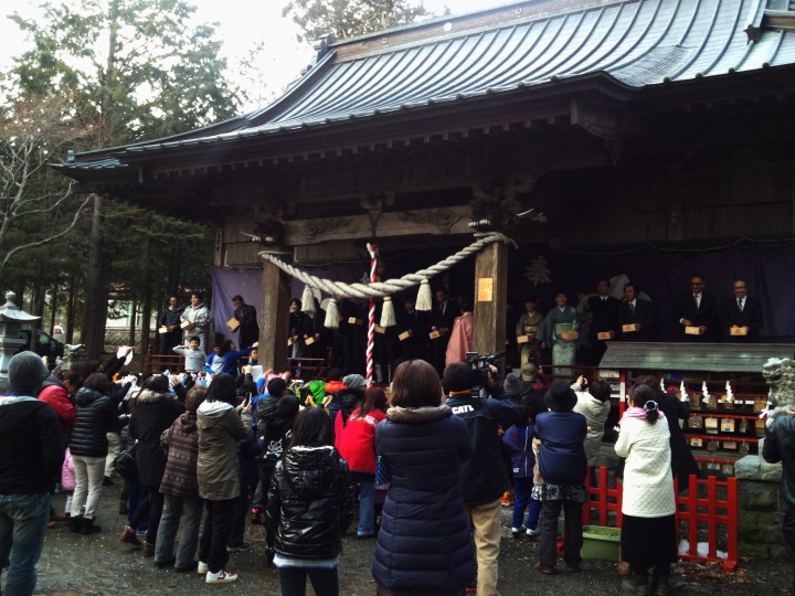 日本全国豆まきイベントで盛り上がりを見せていますが、ここ山中湖でも「山中湖浅間神社」と「平野天満宮」でも賑やかな豆まきが行われました。招福豆とミカンのおまけ付きの袋を厄年のみなさんが勢いよく投げていました。14/02/03