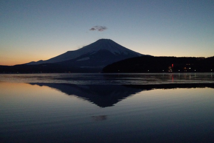 夕方5時30分ごろの山中湖の景色です。風もなかったので綺麗な逆さ富士が湖面に映っていました。この刺さるような寒さがなければ良いのですが・・・おそらく氷点下でしょう。夏では撮れない一瞬です。