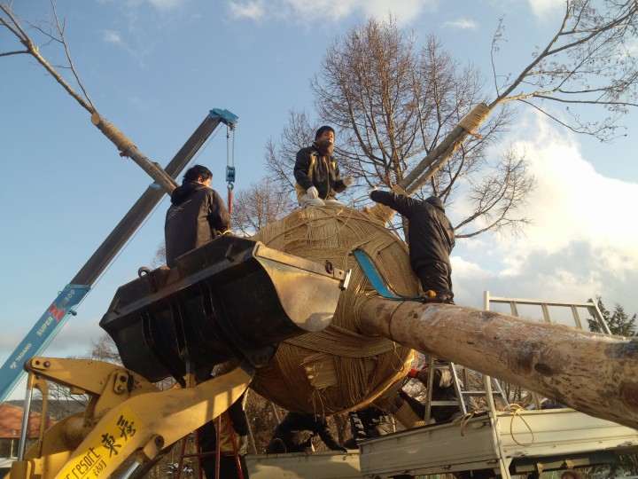今日の山中湖は晴れ、朝方は-14℃まで気温が下がりました。日中も1℃までしか気温が上がらない中、1月14日に向けて御神木祭の関係者は頑張っています。山中湖村で一番大きな御神木の制作状況は平野コミュニティセンター駐車場で見学できます。ぜひ見に来て下さい。写真は通称「たいこ」の部分、だいぶ丸くなってきました。