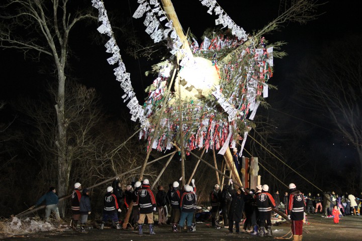 本日夜6時から御神木建てが始まりました。祭典委員会のほか消防団の協力の元、子ども達など地域住民全員参加で大変盛り上がりました。「アラヨーイサー」の号令で少しずつ御神木が上がっていくのは毎年の風物詩です。14/01/14