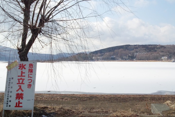 写真右側は凍った山中湖の上に雪が残って白色、左側はまだ凍っていない山中湖です。この位置が氷の境界です。