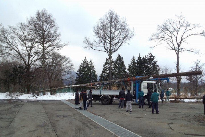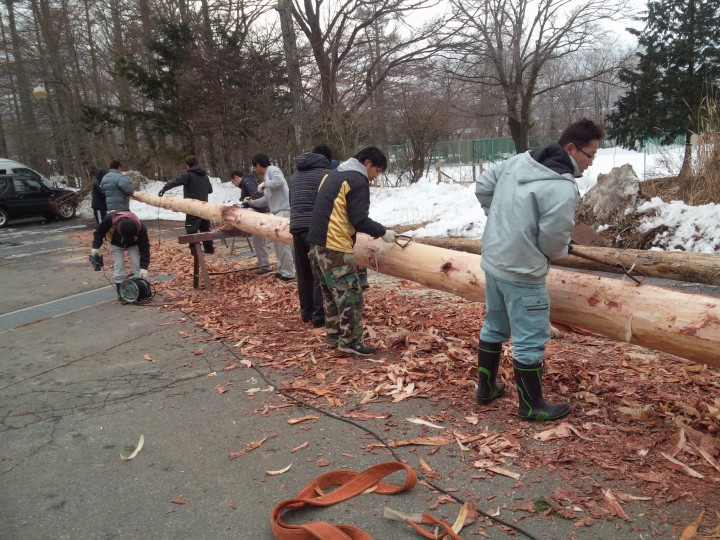 今日は御神木祭に建てられる添え木の切り出し作業を行いました。多くの関係者が協力し合って無事に運搬も出来ました。この後、カンナ掛けを行い本日の作業は終了です。
