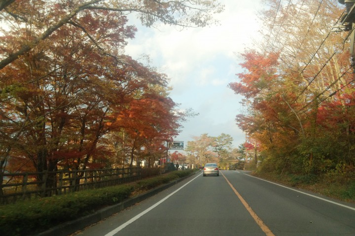 旭丘地区から平野地区へと向かう国道413号線を写真に撮りました。紅葉がとても綺麗です。開催されている山中湖紅葉祭りは写真左側、明日11/10まで夜ライトアップしています。