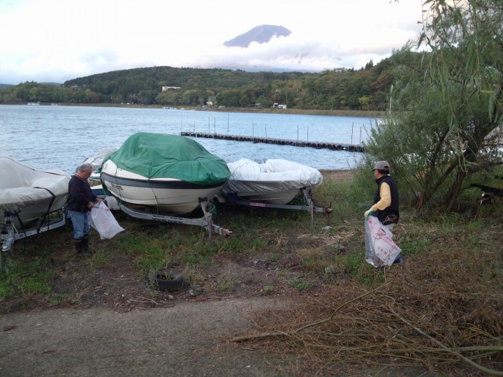 今日は第2水曜日、村内一斉清掃の日です。朝6時に地域住民で山中湖を綺麗にしました。写真には山中湖越しの富士山が見え、よく見ると富士山頂には小さな雲がかかっています。
