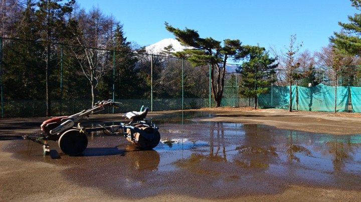 今日はテニスコートの転圧用ローラーの水を抜きました。冬に凍ってしまうのを防ぐために、毎年行っています。抜いた水に富士山が映って、逆さ富士になりました。