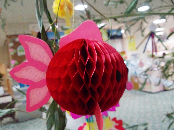 7月7日、七夕です。写真は山中湖温泉『紅富士の湯』に展示されていた七夕飾りです。最近の飾りは種類が増えて、短冊よりも先に目がいってしまいます。写真は金魚でしょうか。かわいくてつい撮影してしまいました。