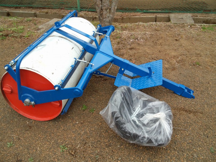 当館の下段テニスコートの転圧ローラーがだいぶきしみ始めたため、先日、新品のローラーを購入いたしました。注水式で重量が250kgf、水を満水すれば1tfになるそうです。使用前は白くてゴルフのドライバーみたいですが、使用するにつれて白い塗装ははげていきます。このイス付きローラーを耕耘機で牽引してテニスコートを転圧します。