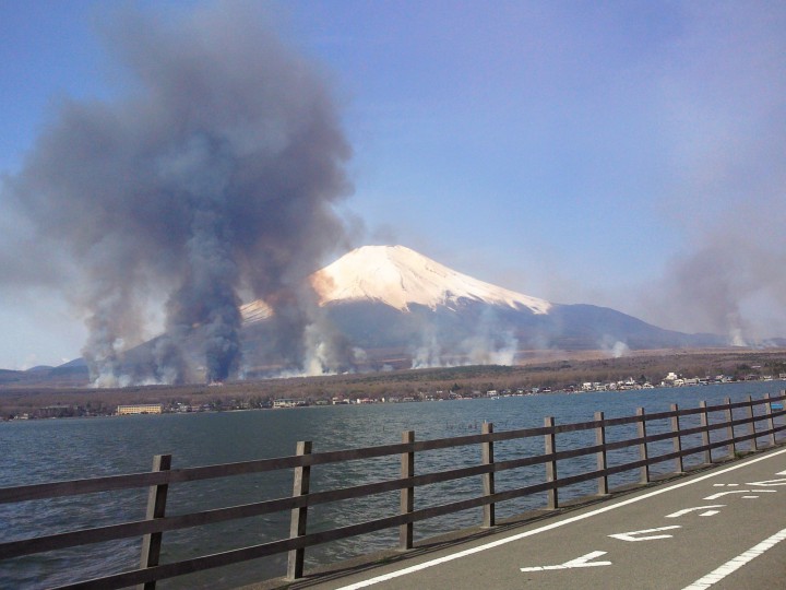 合成写真でも、災害でもありません! 昨日紹介した北富士演習場の「火入れ」です。山中湖からは写真のように見えました。分かっていたことではありますが、いざ目の当たりにすると異様な景色です。13/04/15