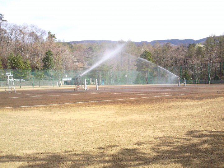 連日の良い天気もテニスコートにはあまり良い状態とはいえず、カラカラに乾いたコートに水分補給を…ということでスプリンクラーの登場です。目安は「水たまりができるくらい」を目指して、かれこれ3時間。本当に乾燥していたようです。