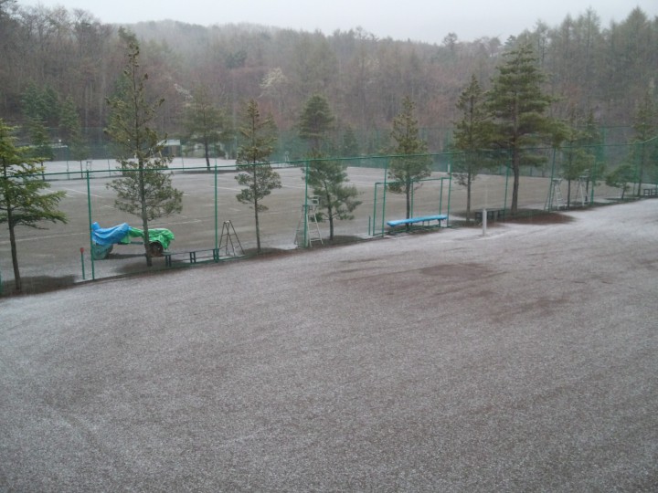 連日の良い天気もテニスコートにはあまり良い状態とはいえず、カラカラに乾いたコートに水分補給を…ということでスプリンクラーの登場です。目安は「水たまりができるくらい」を目指して、かれこれ3時間。本当に乾燥していたようです。13/04/18