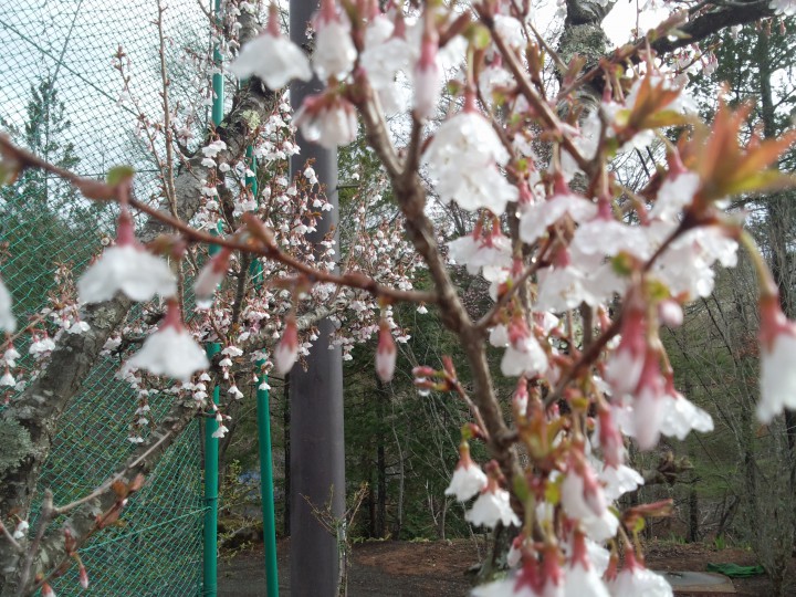 共立テニスロッヂの桜が咲きほころんでいます。例年だとゴールデンウィーク辺りに咲く富士桜ですが、他の地域と同様に山中湖の桜も例年よりも早めです。今年はあまり見られることなく、散ってしまいそうです。
