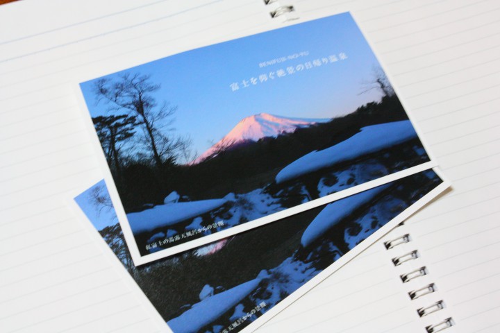 今日2月23日は「富士山の日」です。県内外で記念イベントが催されているそう。今日の写真は富士山だとシャッターチャンスを伺っていましたが、いつの間にかの曇り空…(夕方には雪が降ってきたりして)なので、富士山ポストカードです。山中湖温泉「紅富士の湯」でいただきました。