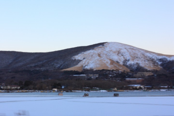 今日の山中湖は最低気温は−8℃、最高0℃、寒い1日となりました。直射日光により日向の雪は少しずつ溶けていますが、日陰はあまり溶けません。山中湖の氷は平野地区の一部が残っていますがその面積は段々小さくなってきています。写真の富士山は車窓から撮りました。寒いので空気が綺麗です。
