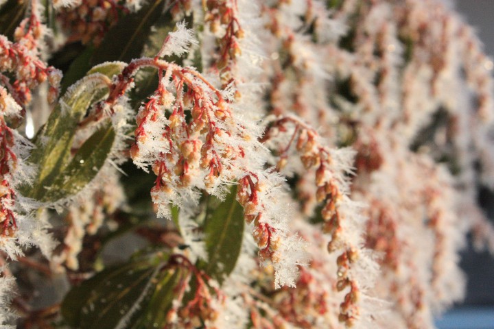 今朝の最低気温-13℃。庭を見ると霧氷が出来ていました。周りの木は枝が白い綿で覆われたようでおいしそうな風景でした。