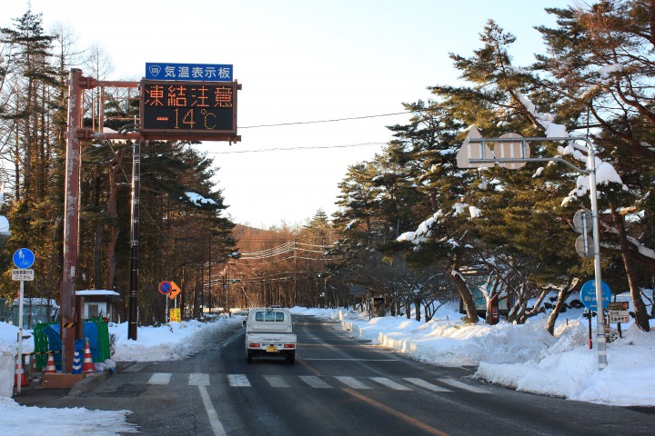 今朝の最低気温は朝6時に-17.6℃を記録しました。写真は朝8時の役場前電光掲示板です。最高気温は2℃。山中湖周辺の道路はまだ除雪されていない箇所がありますので、スピードの出し過ぎに注意して、前方をよく見て運転して下さい。