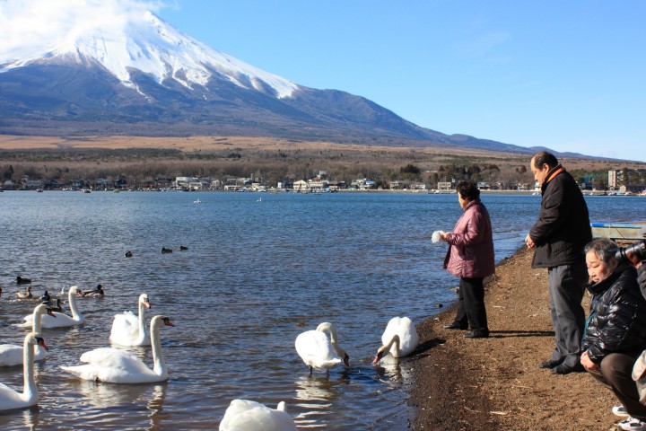 写真は山中湖の北西側、白鳥おじさんがいる場所です。観光客の人たちが白鳥にえさを与えたり写真を撮ったりと毎日人が絶えません。